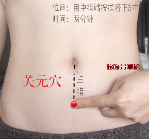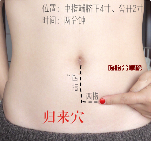 归来穴:归来穴位于肚脐下方四指往左两指的位置,可以用手指按摩2分钟,对于痛经、白带量大有疗效。