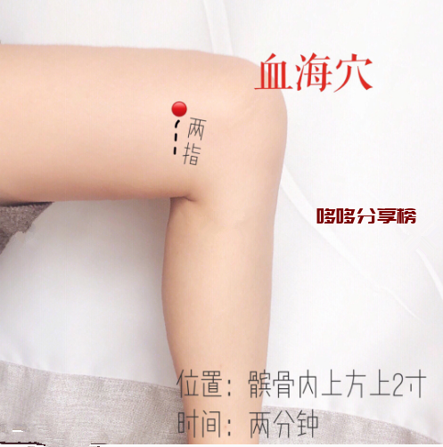 血海穴:血海穴位于髌骨内上方两寸位置,按摩2分钟,血海穴说明与血液有着关系,那它的功效肯定也是活血化瘀,补血养血,引血归经之功效。对于治疗月经推迟有很好的疗效。
