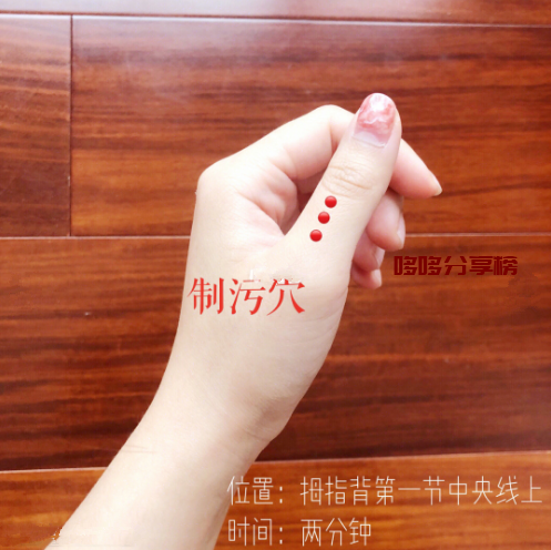 治污穴:治污穴位于拇指被第一关节中央线上,制污穴是可以让经血有效排出的,按摩方式也非常简单,可以用手指,也可以用其他小工具代替按摩,感觉到酸胀便代表着有效果。从中医的角度上来讲大拇指上的制污穴具有行气理气的功效,能够帮助经血顺利的排出体外,能够有效的缓解月经推迟情况。